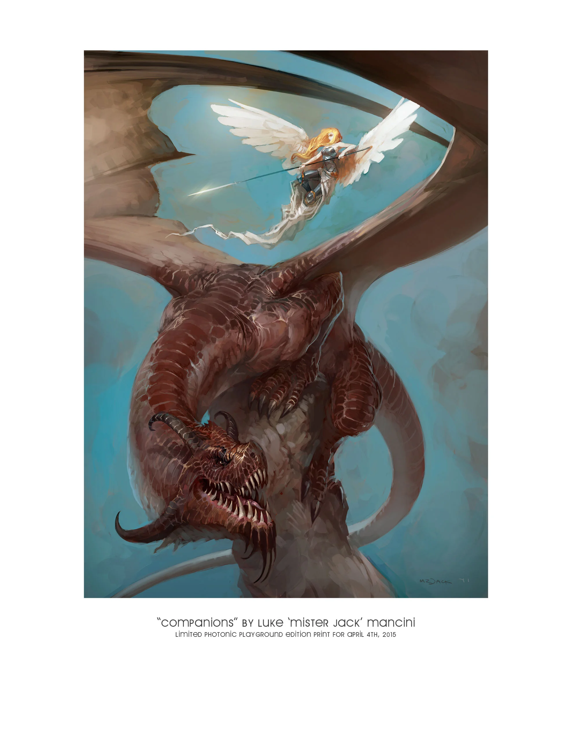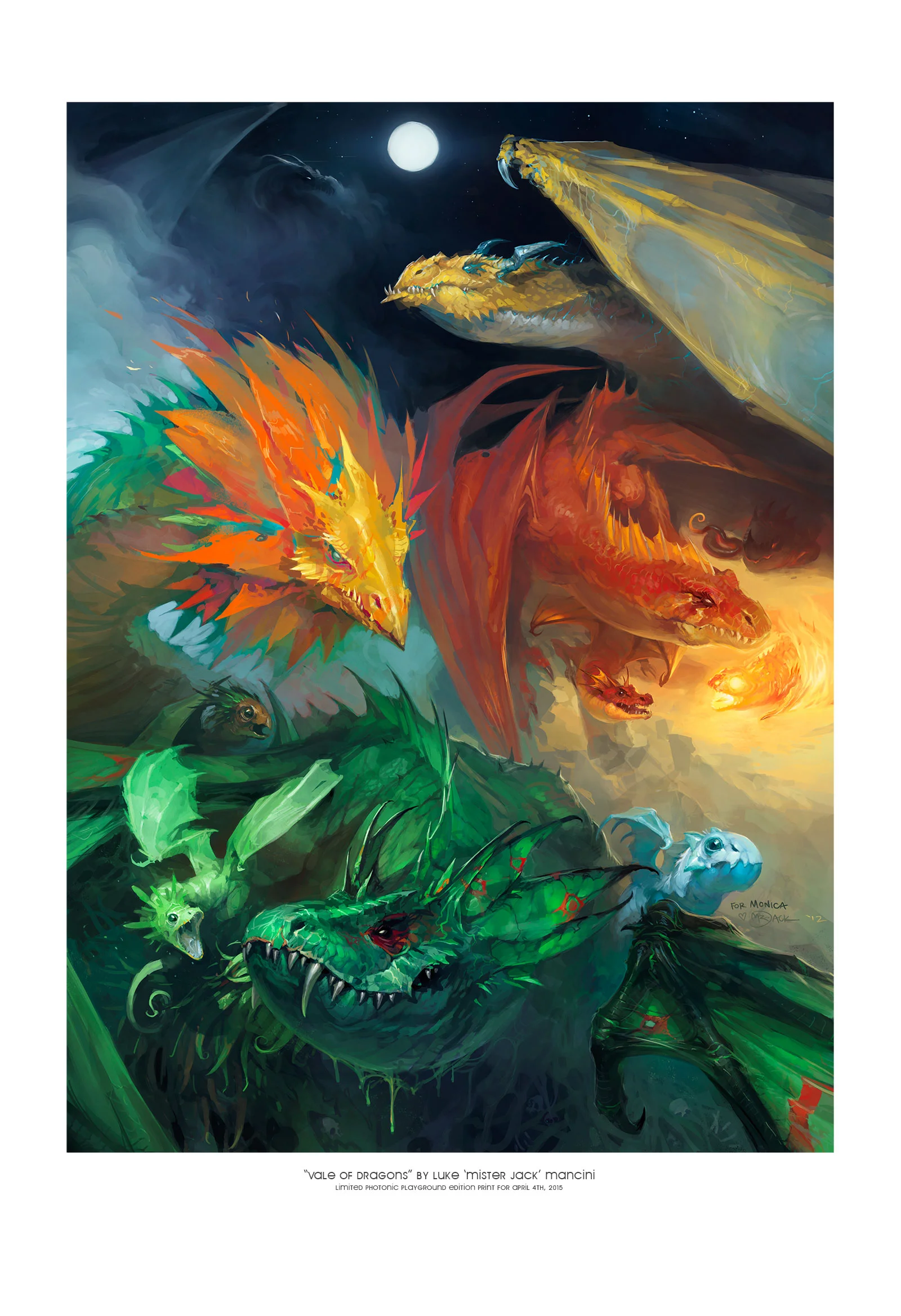 BACK IN STOCK! 13x19" print of "Vale of Dragons" on Epson Ultra Premium Luster semi-gloss paper with archival ink, signed by Luke Mancini. Open edition print. Frame ready with 1" minimum white border. Previous limited editions sold out!