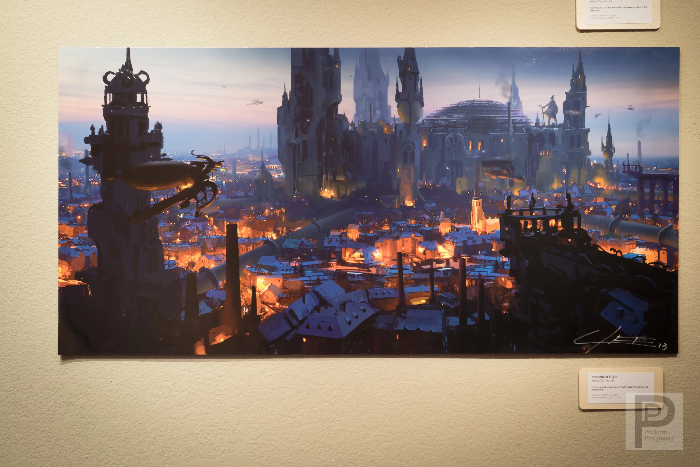 Large print of "Industria at Night", digital painting mounted on foam-core, 25x50" signed by Charles Lee. Description: Charlie made chocolate factory much bigger. Wanka must be proud of him.
