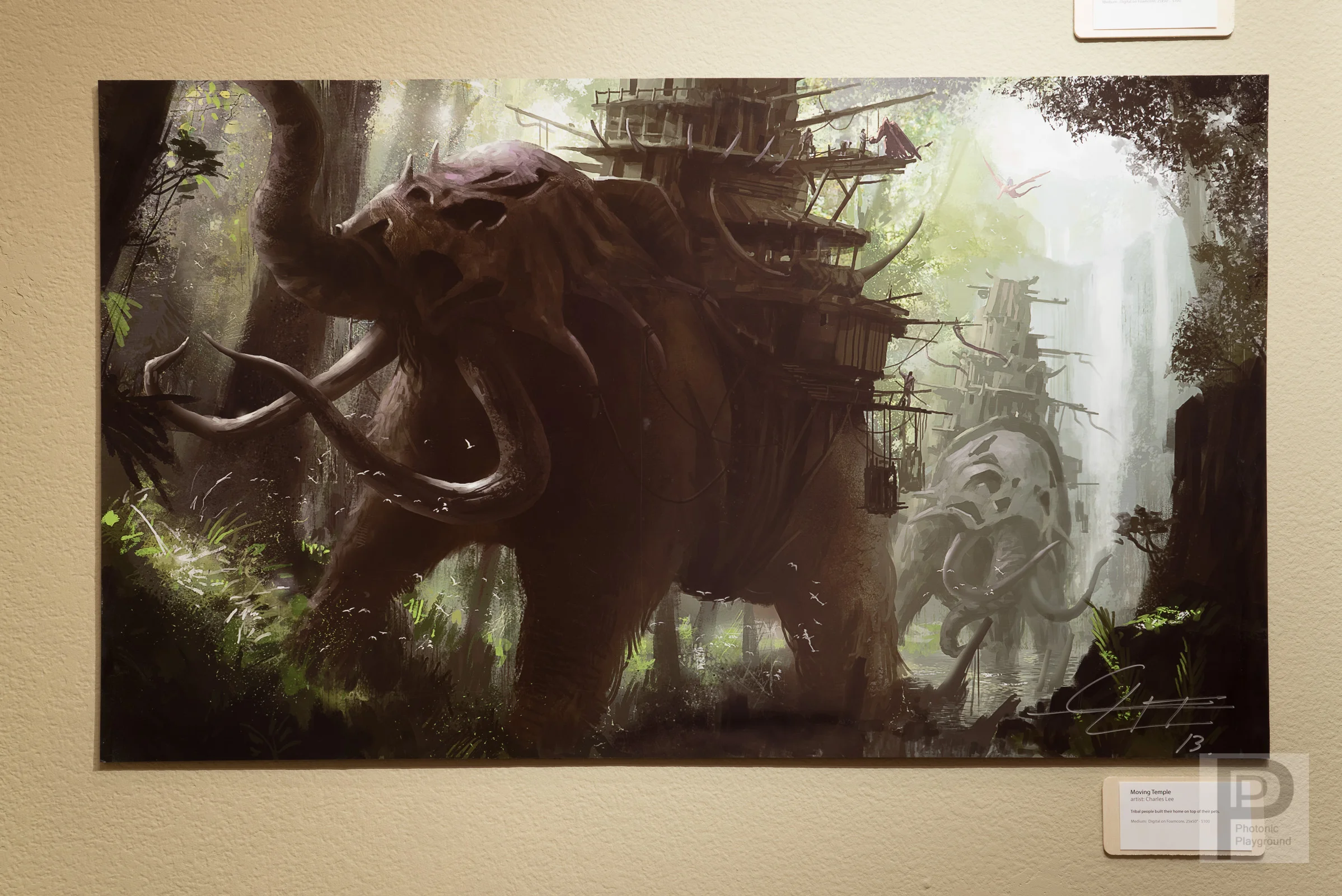 Large print of "Moving Temple", digital painting mounted on foam-core, 35x50" signed by Charles Lee. Description: Tribal people built their home on top of their pets.