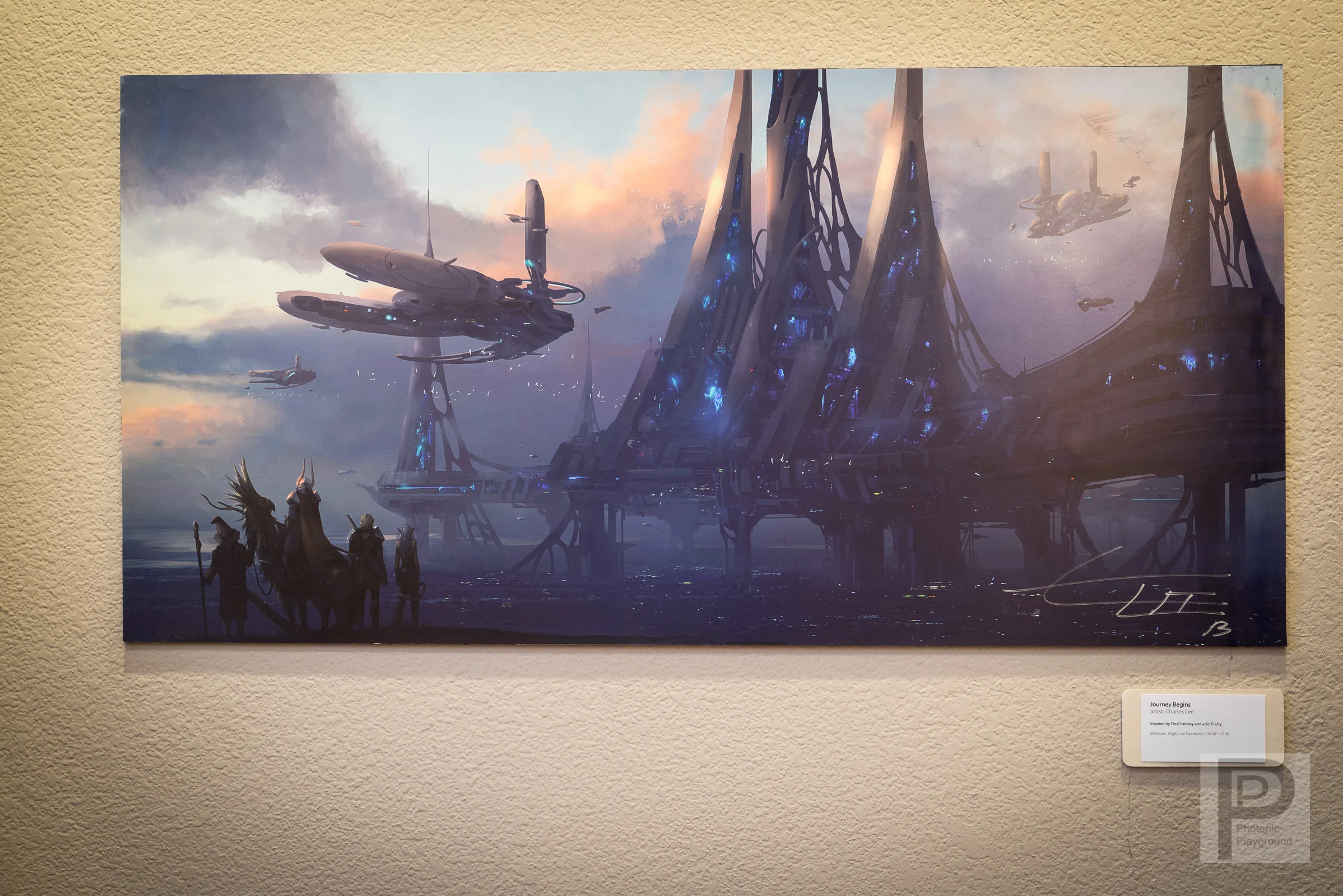 Large print of "Journey Begins", digital painting mounted on foam-core, 20x50" signed by Charles Lee. Description: Inspired by Final Fantasy and a Sci Fi city.