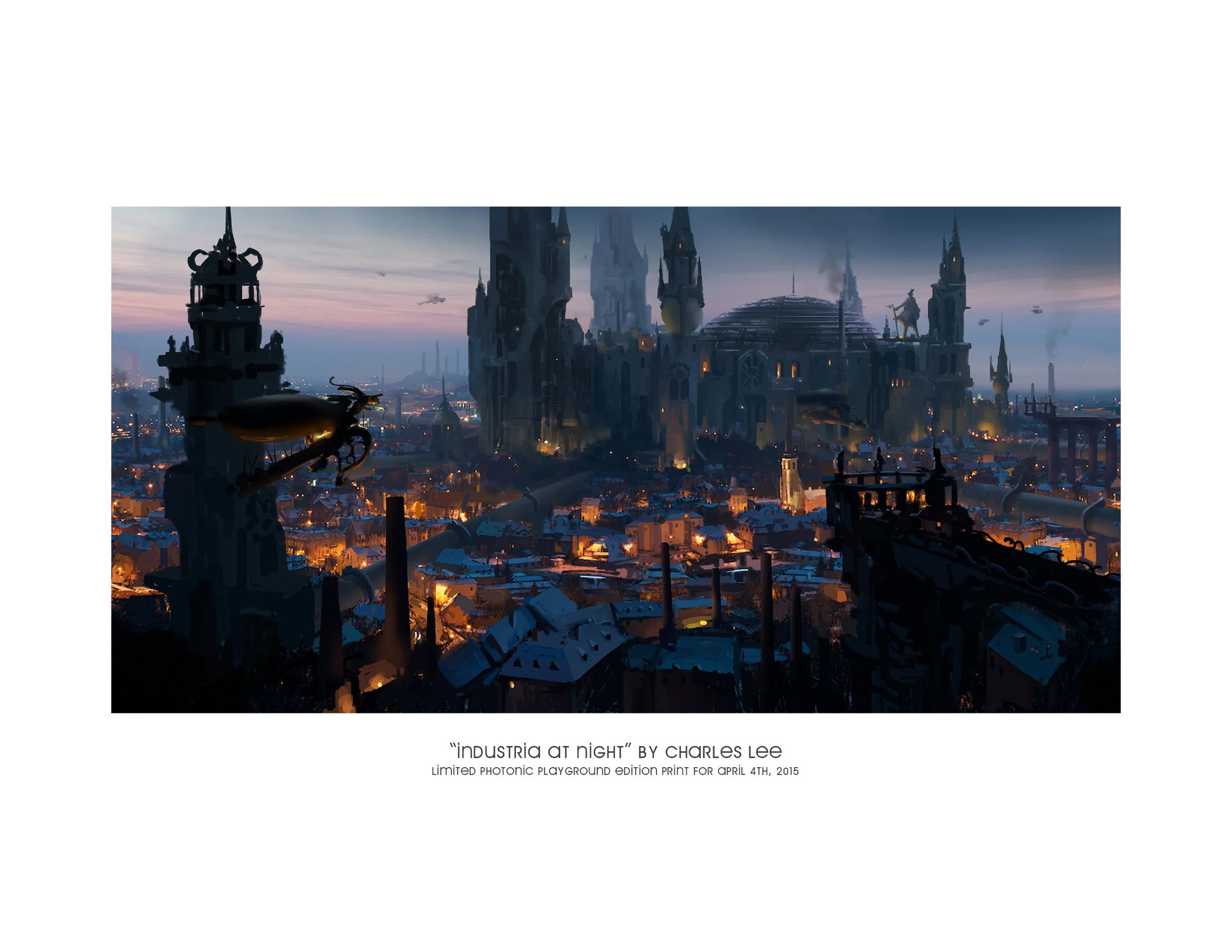 8.5x11" print of "Industria at Night" on Epson Ultra Premium Luster semi-gloss paper with archival ink, signed by Charles Lee. Limited print run of 5. Frame ready with 0.5" minimum white border.