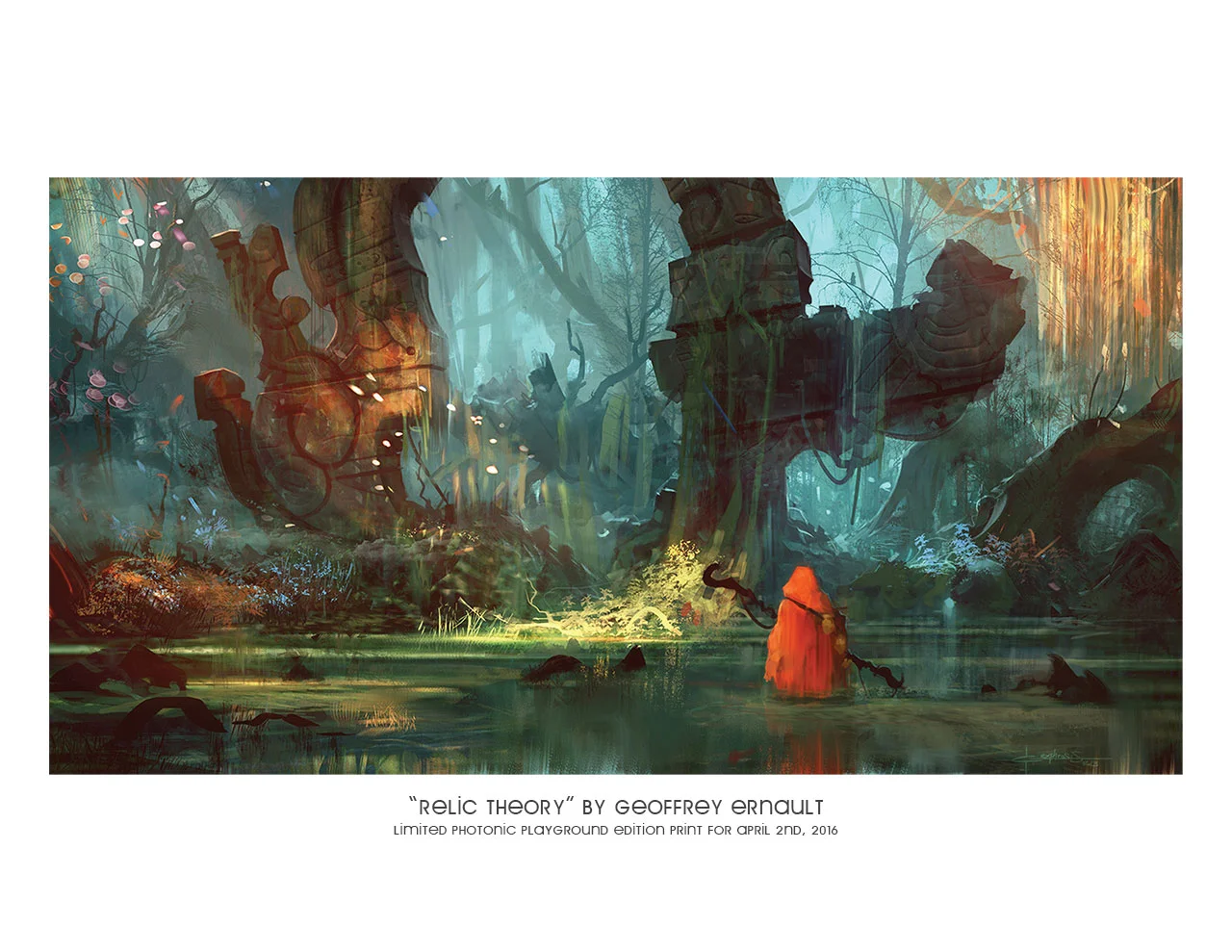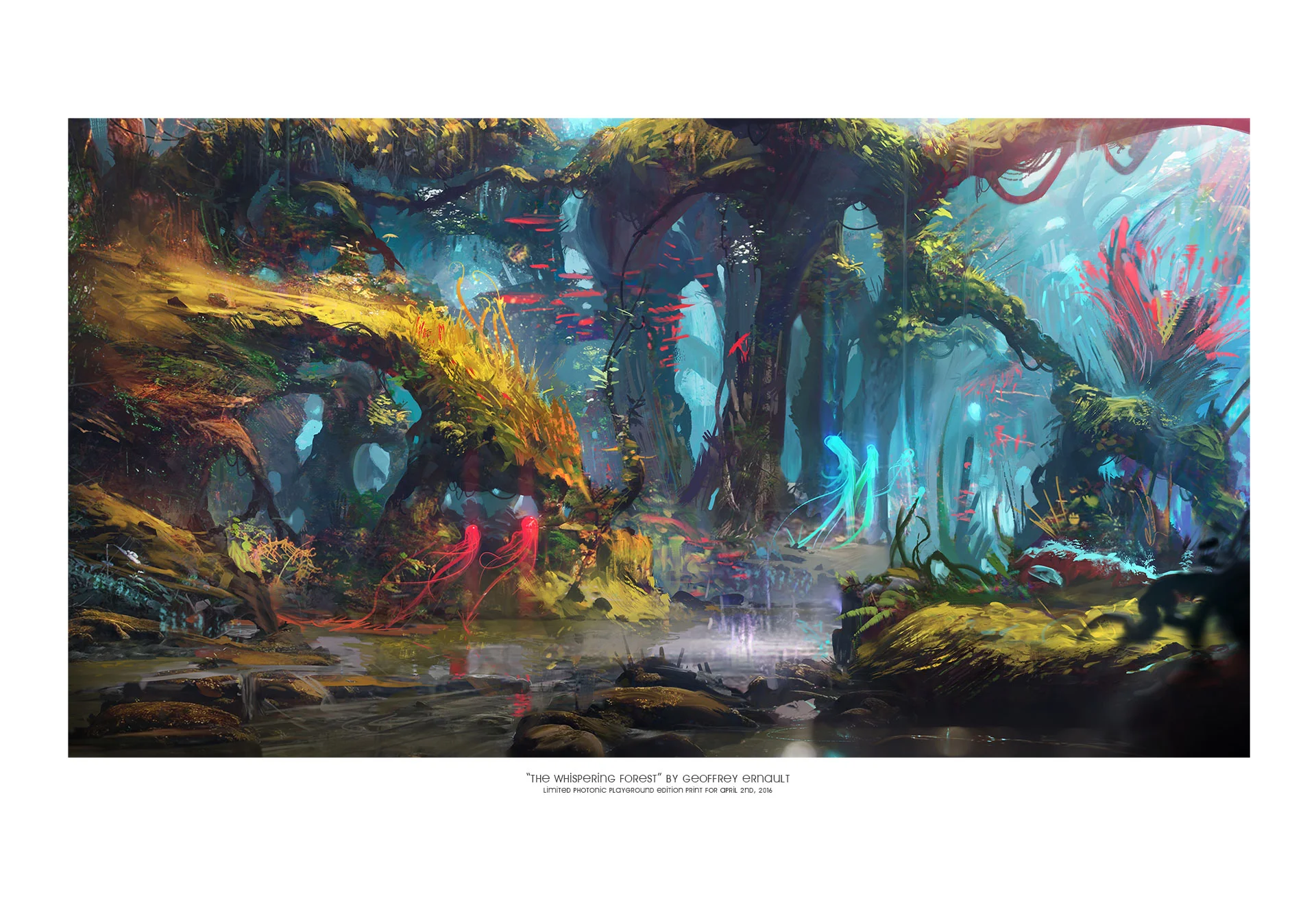 Description: The Whispering Forest started as a demo during a livestream, that I finished later on. I wanted to capture the essence of underwater flora and fauna and try to mix that with a swampy forest. That allowed me to push the colors a bit, and add a bit of fantasy. It is also a place of ritual for jelly-fish like creatures to dance in harmony and bound. They become blue when in harmony, and red when incompatible.