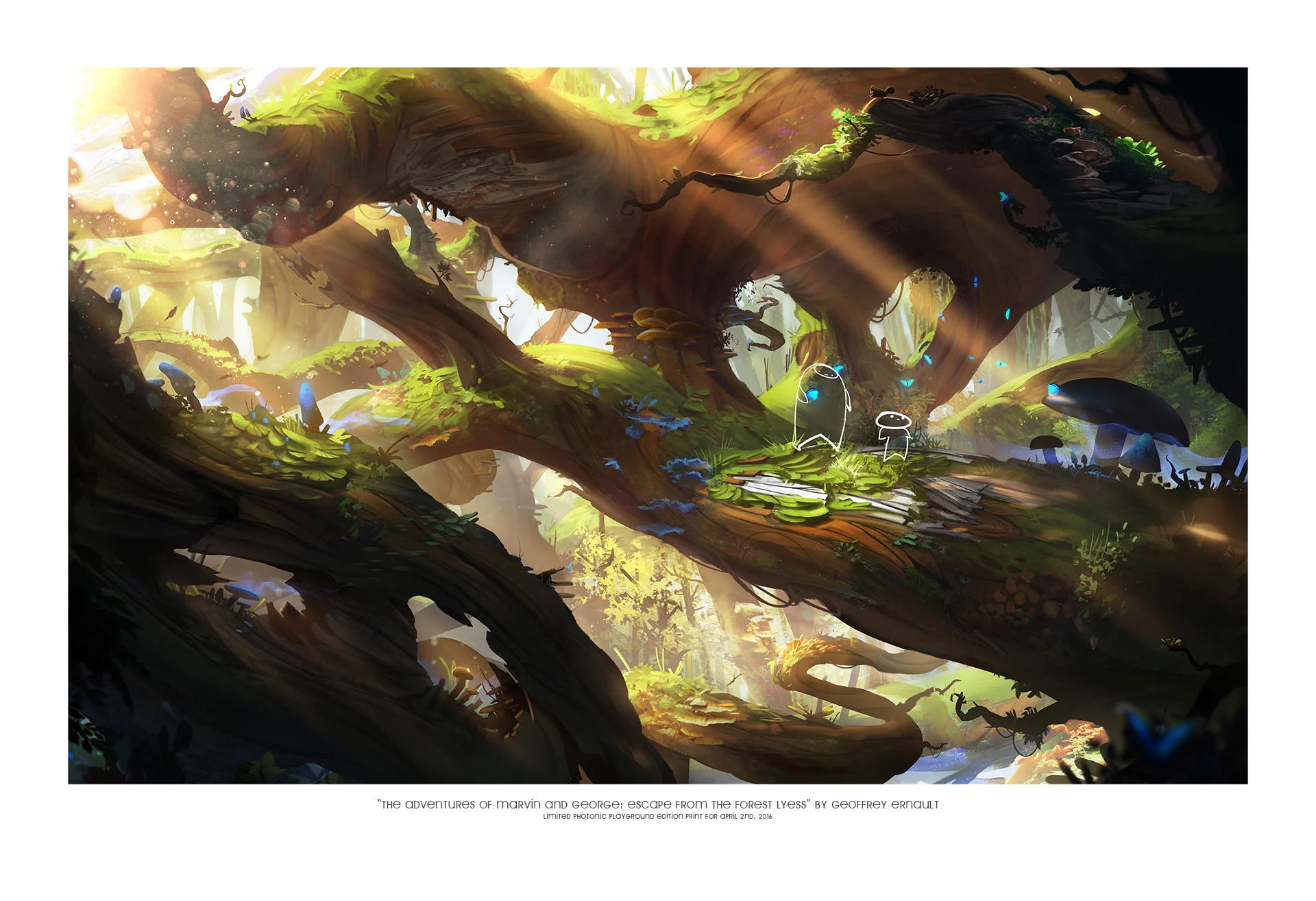 "The Adventures of Marvin & George: Escape from the Forest of Lyess" a premium 13x19" giclée print on Hot Press Bright matte paper. 100% Acid and lignin free, archival quality. Limited to 5 prints, signed and numbered. April 2016 edition SOLD OUT! May 2016 reprints available.