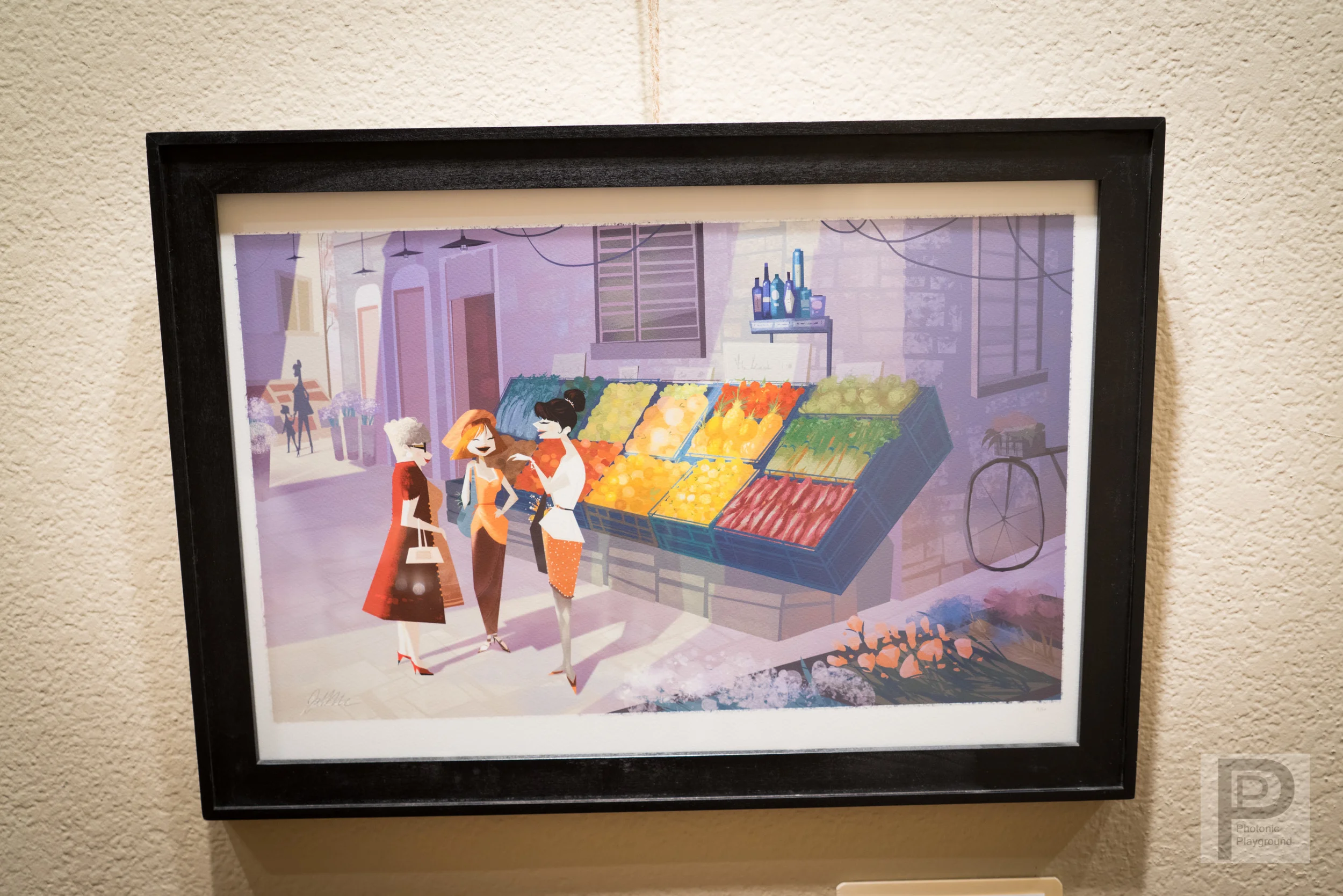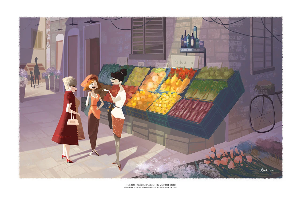 Framed giclée print of "Italian Marketplace" digital painting, 13x19" by Janna Bock.